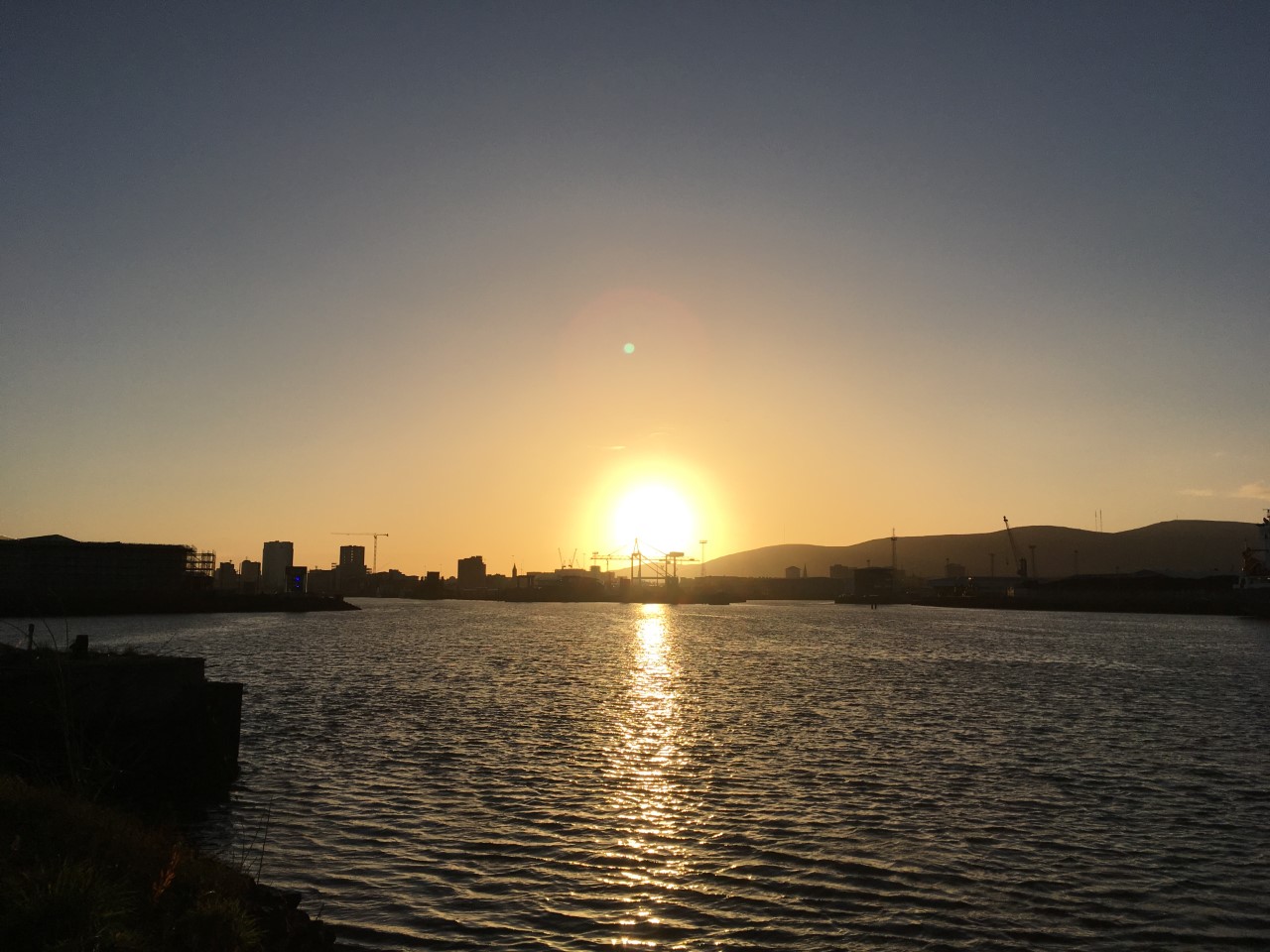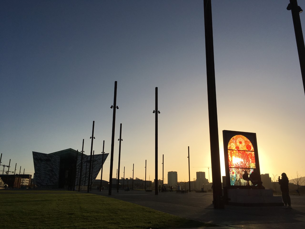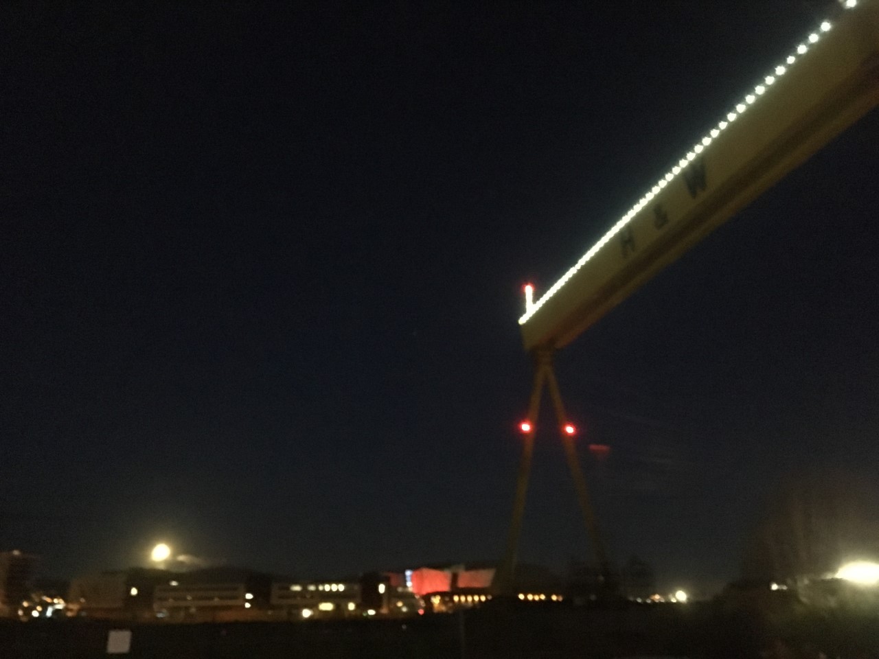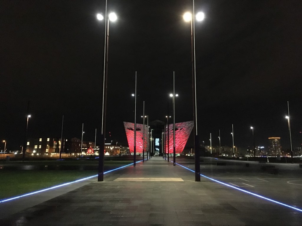 Oooh! And a cruise ship too. Worth the trek.You might even see a ship passing, and wave wildly, and see someone wave back!One of those Game of Thrones stained glass windows that are dotted about, at the end of the Titanic slipway, in October sun. It’s a whole new world at night. Start at the Big Fish and walk the ‘Maritime Mile’ to HMS Caroline. Fabulous. December 2020January 2021. Where else can you go for a stroll and run across a spectacle this? That’s the moon, bottom left! 7.30am, a few days after Christmas 2020.