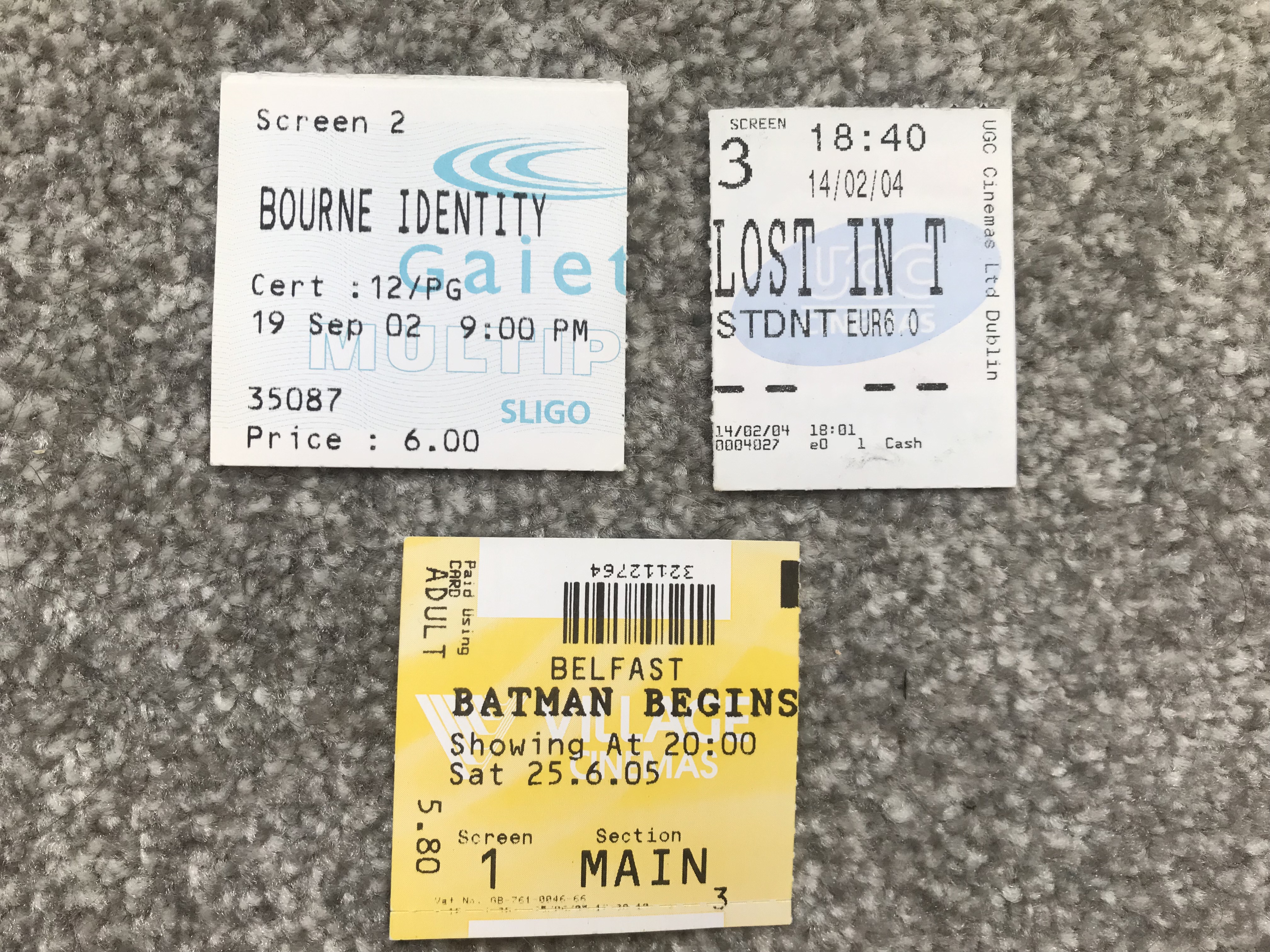 You also want a bit of meat in your ticket, a bit of texture. The most underwhelming type of ticket is the very thin paper kind that comes from a roll, like shop receipts. It’s better than nothing but, as my collection proves, the ink fades from these very quickly. By contrast, here are some firm movie stubs which have aged very well.
