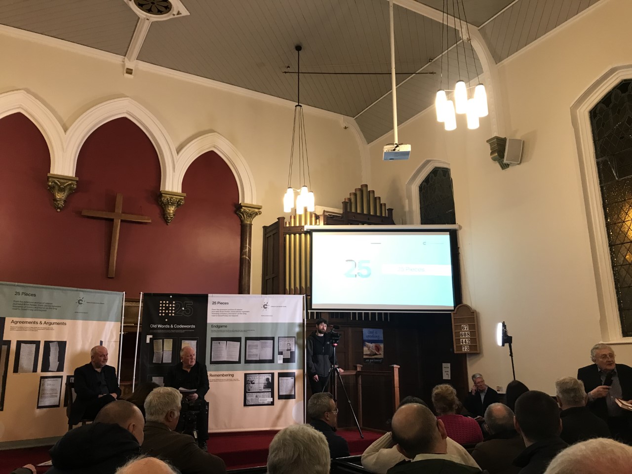 We had a closing word from Rev. Harold Good, another witness to much of this history. He jokingly denied it was a churchy ‘epilogue’, but that’s pretty much what it was, and it’s what was appropriate. With clerical gravitas, he noted the remarkable journeys of some of the people in the audience, and pointed out that there are still plenty of people in Northern Ireland who need to go on a journey. ‘Gratitude for the past, and trust in the future’, was his final message.