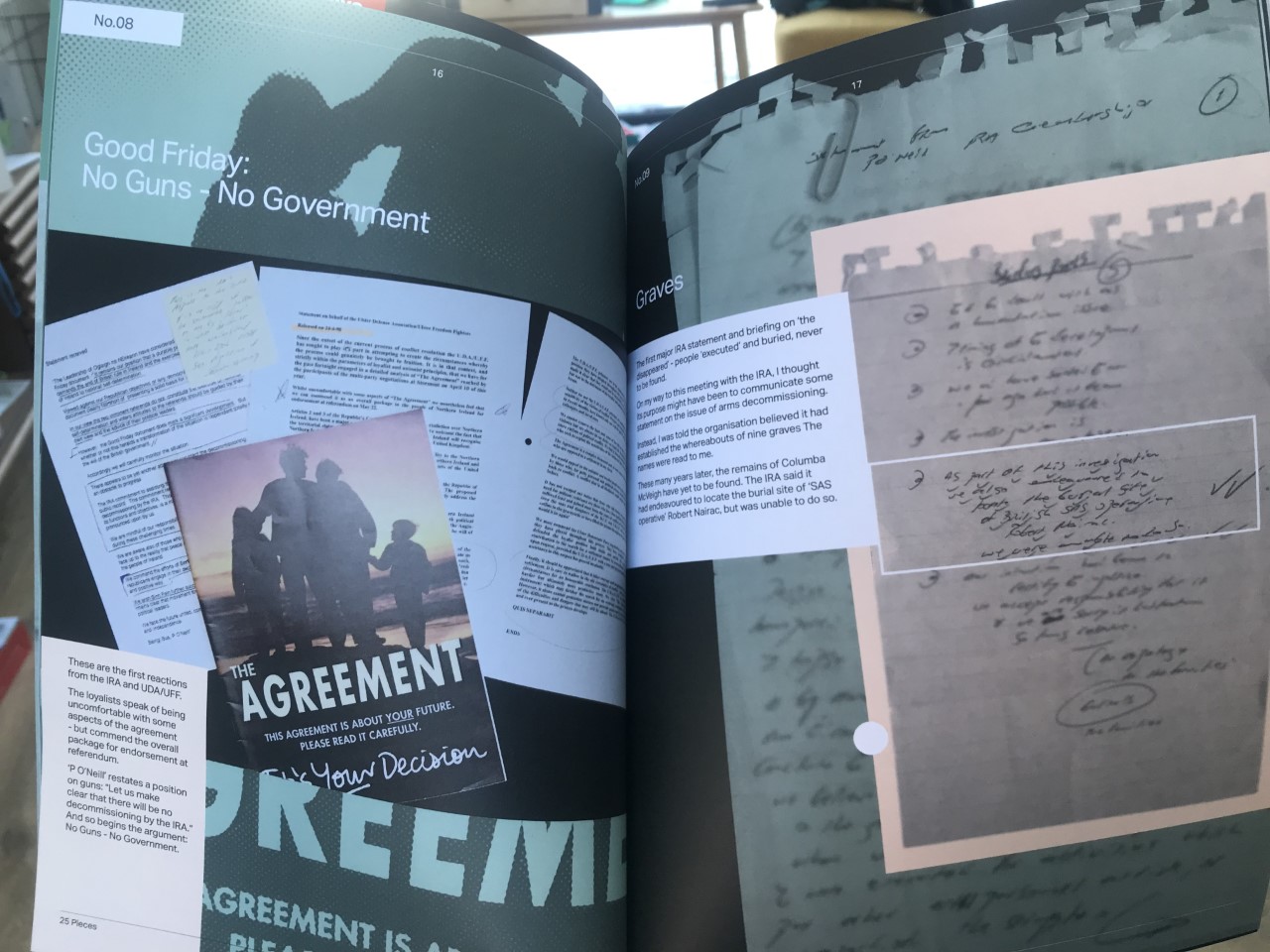 As a fan of significant and old bits of paper, the concept of the event appealed to me. It involved 25 documents from Rowan’s personal collection which charted the last thirty years of peace processing in Northern Ireland. It traced media history too: they ranged from paragraphs written on a typewriter, scribbles on a taxi voucher, to tweets.