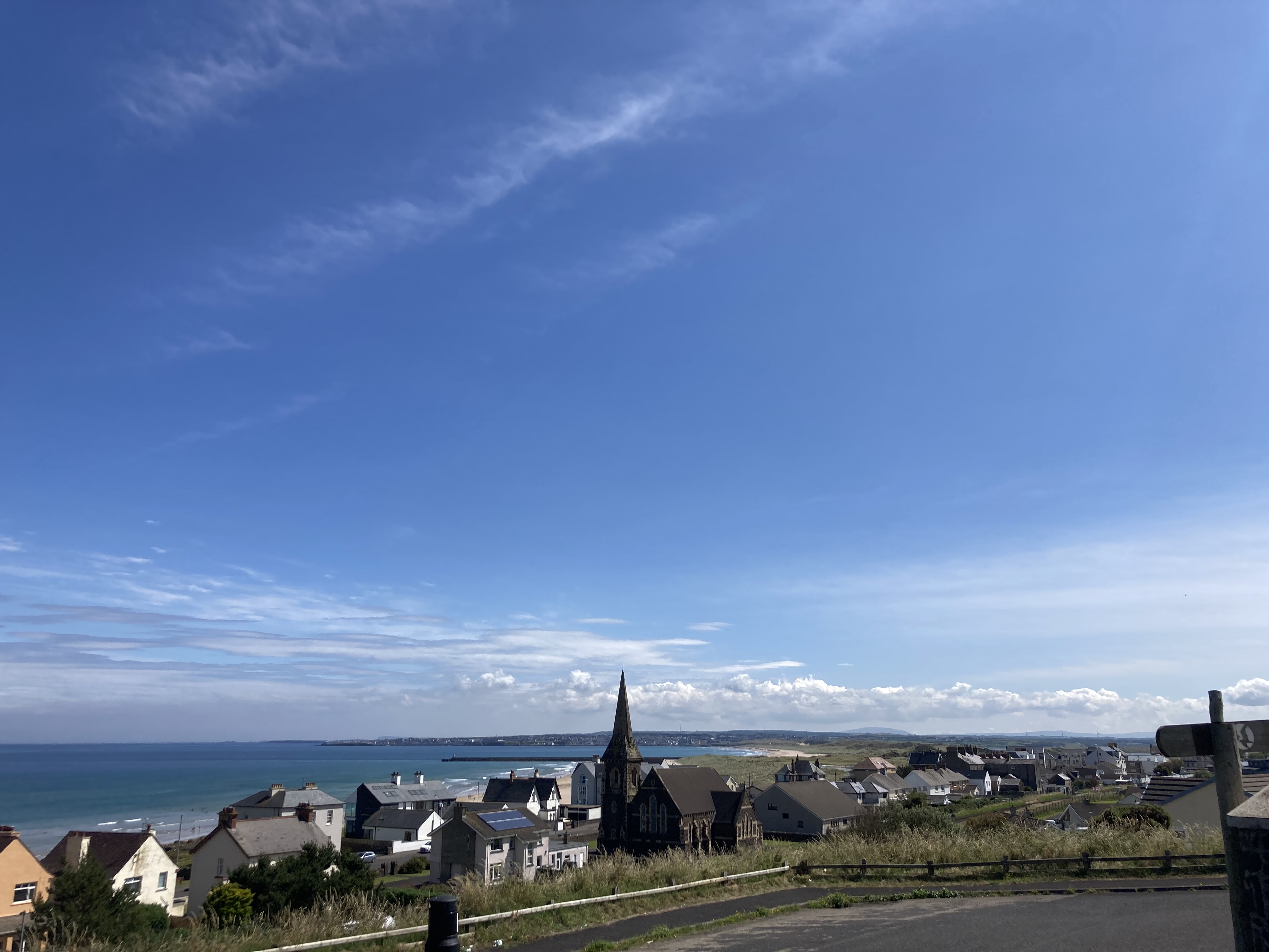 Buoyed by the joy of dolphins and being described as a nice gentleman, I entered Ballycastle. We rarely go there (it’s even further from Portstewart than Castlerock!) but my friend Jin was in the Corrymeela Centre and I was going to pop up and say hello. In an earlier blog post, I had suggested that Ballycastle was much less grim than Portrush and Portstewart, and floated the idea, noted by someone else, that the grimness of the Ports was due to their lack of trees. And perhaps here was the theory confirmed: Ballycastle has trees, a few at the sea front. A green landscape is also clearly visible from the town. So the lesson is that if you are a town and don’t want to depress your residents, you should plant trees.