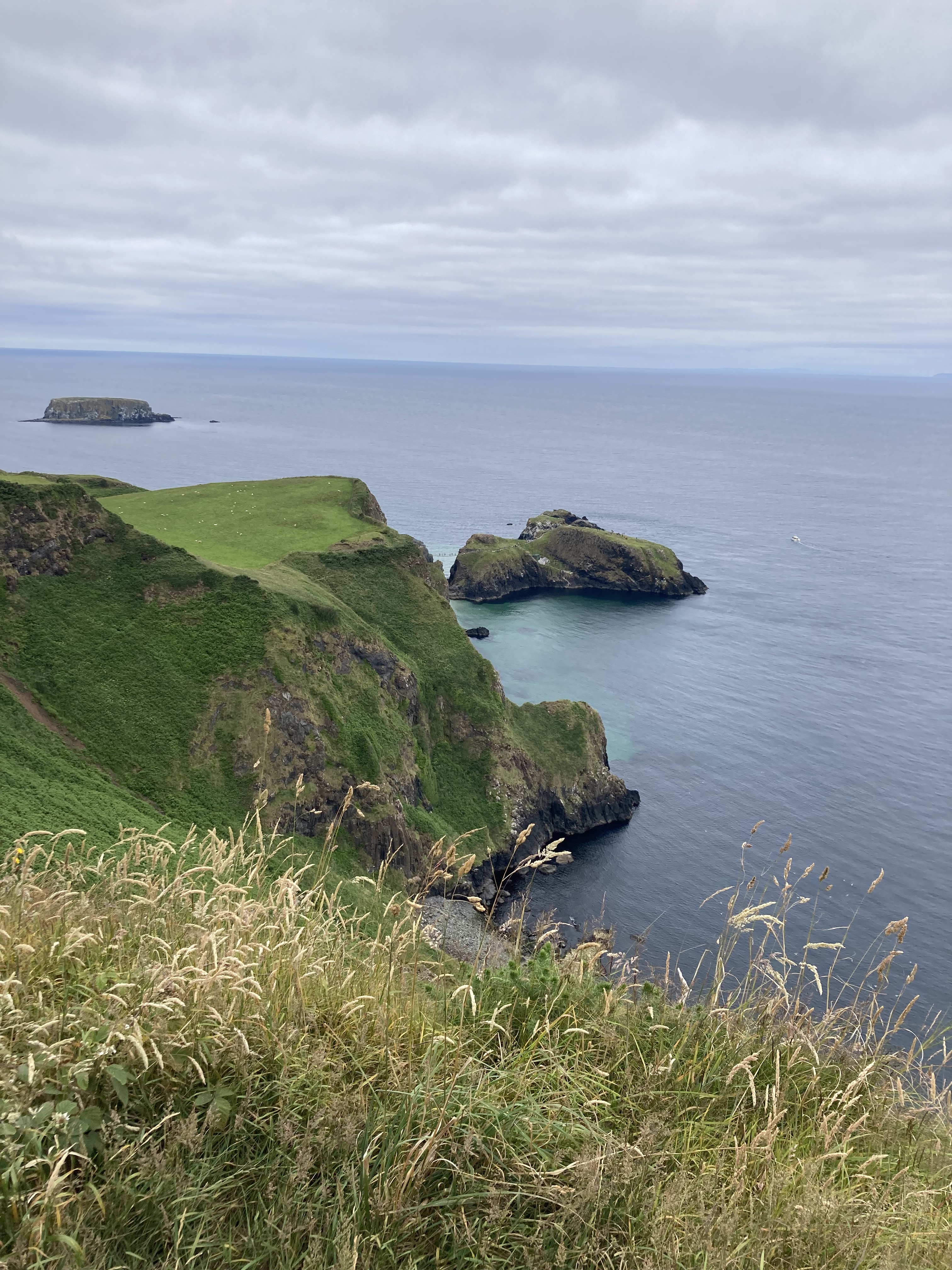 Not far outside Ballycastle, I spotted what looked like a viewing point and swerved off the road. I’m a sucker for a good viewing point, and I got out of the car, on my own, to do some viewing. This one, Portaneevy, has fun little platforms which hover over the abyss. There were busloads of French, American, and Japanese tourists, but I managed to get a spot and peer down over Carrick-a-Rede rope bridge.
