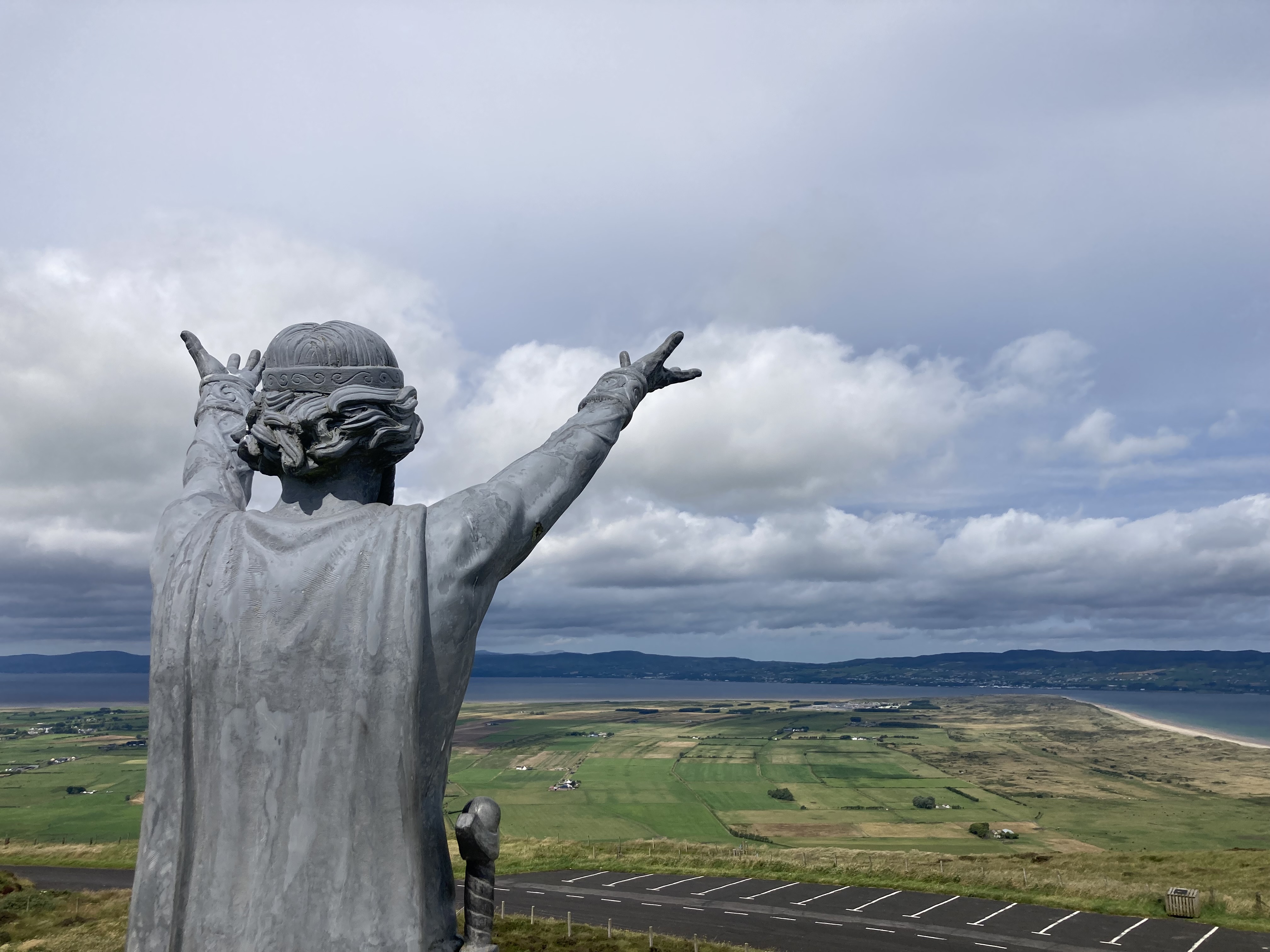 On the landward side of the road were steps that led to an even higher lookout. Up there was the statue of a man standing on a boat, arms outstretched over the vista. In this photo he looks like he is blessing the car park. In fact, he’s calming the tumult of the sea, for this is none other than Macannán mac Lir, Celtic god of the sea, the Irish Neptune. He’s extraordinarily lean; Michealangelo’s ‘David’ would look pudgy if the two were ever to meet. But I liked him. This trip was going very well.