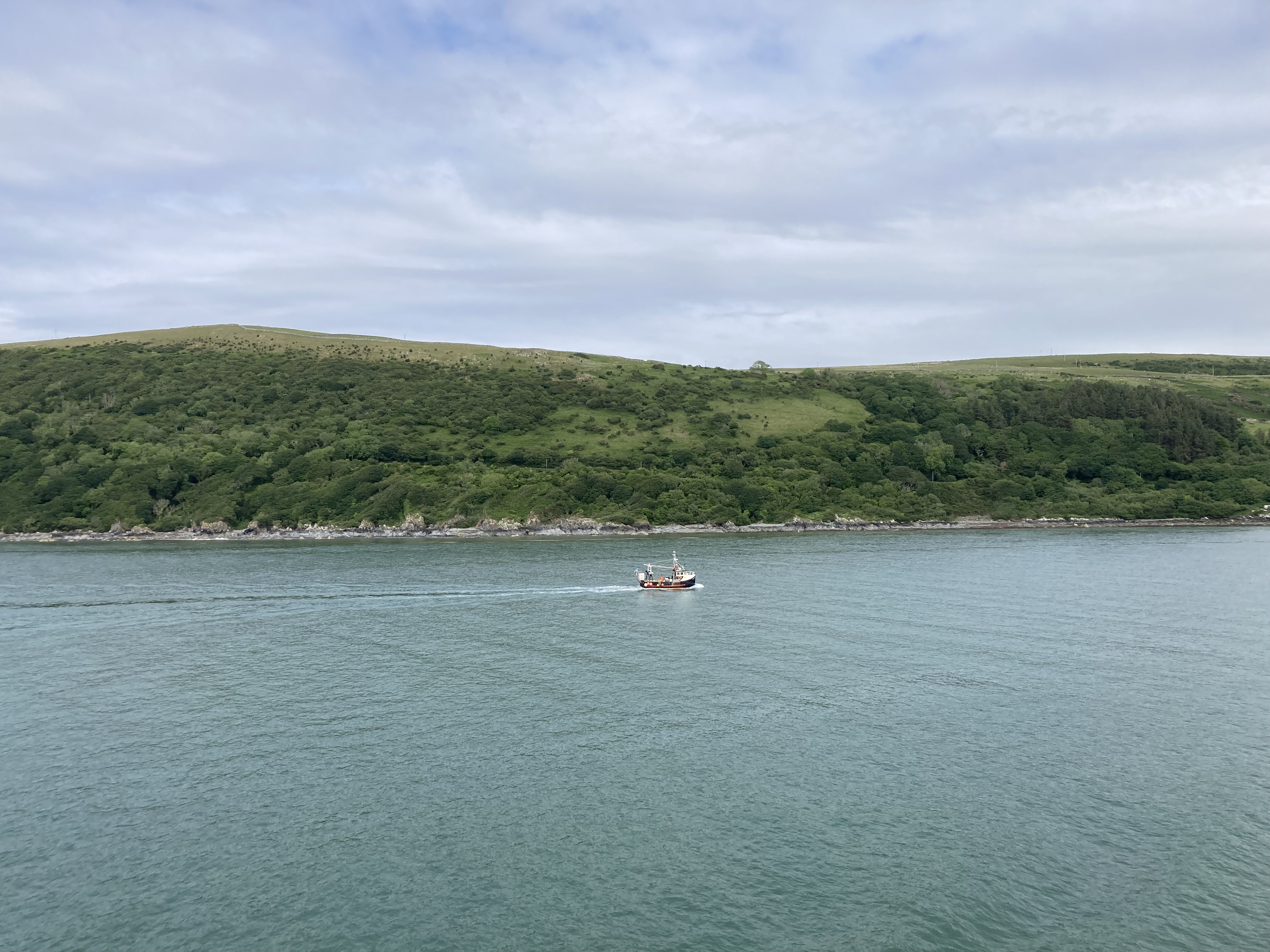 The ferry stays with the coastline for quite a while as it comes out of Cairnryan. Scotland was a bar of solid green, with tiny white waves splashing silently at the bottom. The feel of the newly-appeared sunshine was like when you hover your hand over a toaster – a real emphatic heat, despite the chilly air. Quite a few of the very diverse passenger complement – Americans, Japanese, and less identifiable nationalities – were now out taking shots and selfies, leaving the boat’s interior full of idiots who didn’t think to be outside. There was a lighthouse. If I’d seen a dolphin then, my contented head would’ve exploded.