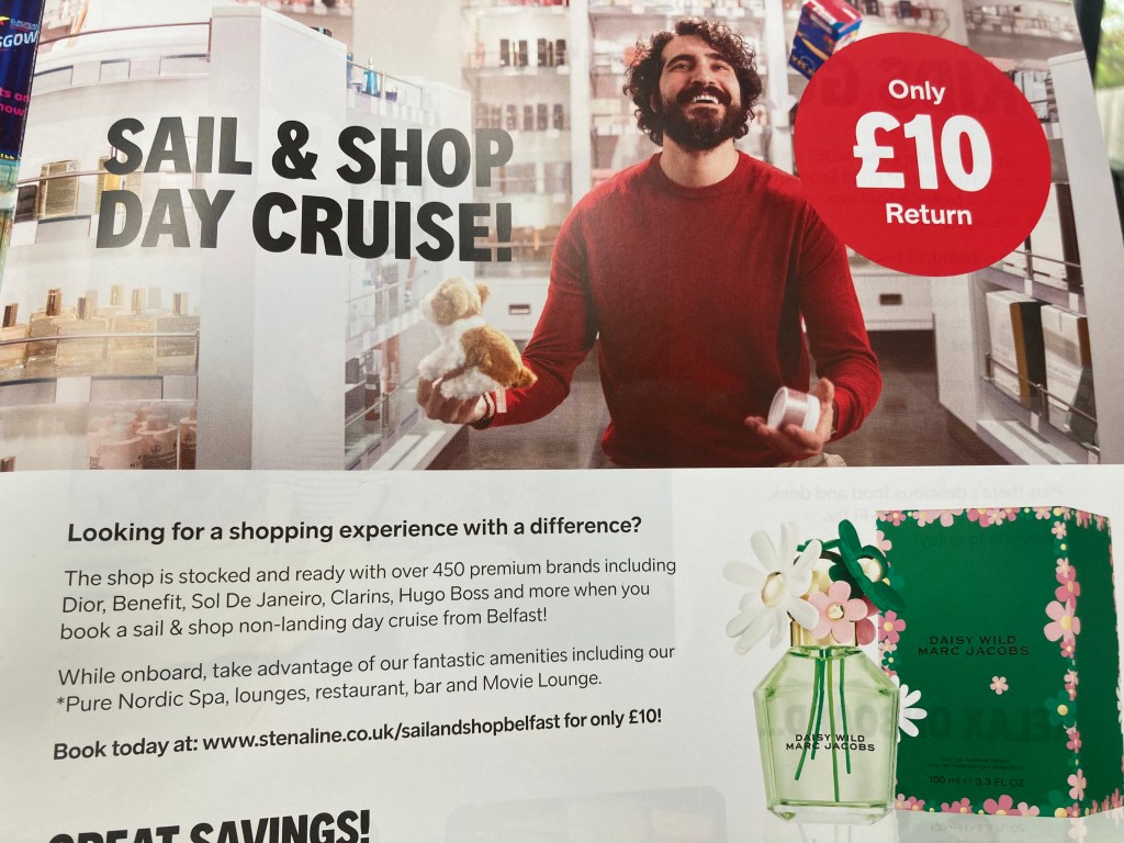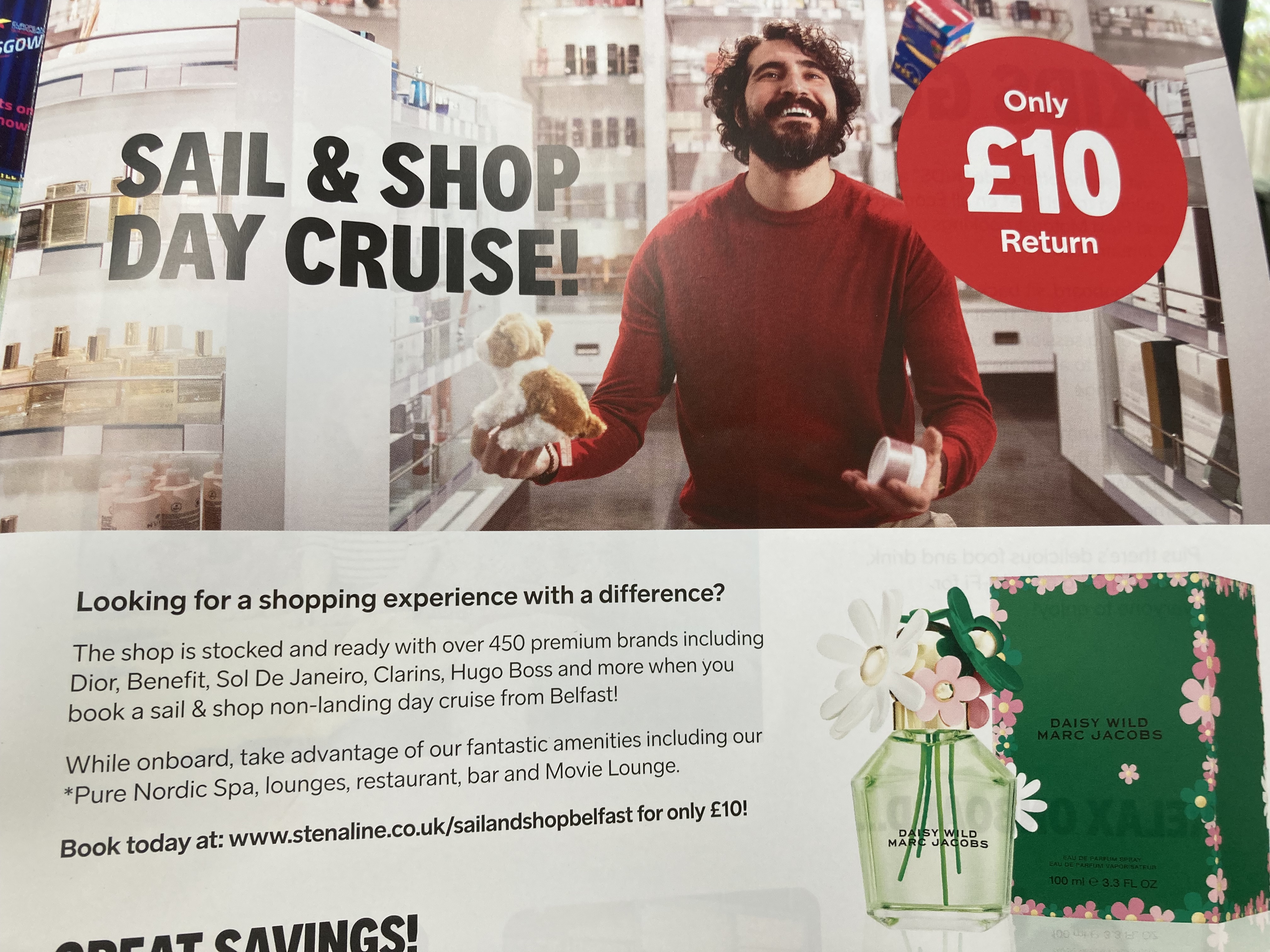 The Scottish barman said this to me as I sat alone in the empty horseshoe-shaped lounge at the front of the Stena Line ferry. I was on a ‘non-landing’, ‘Sail and Shop’, ‘day cruise’, from Belfast to Cairnryan. This was the non-landing part, ninety minutes during which I remained on the ship at Cairnryan with the crew as they did the vacuuming and whatever else.